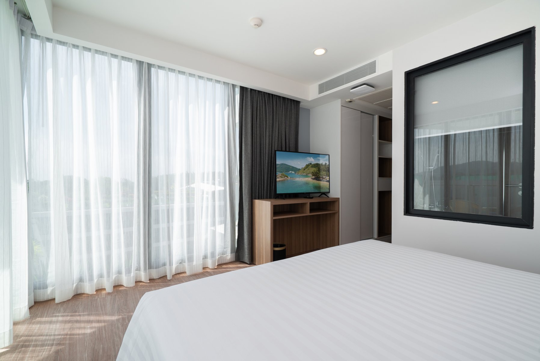 | The Two-Bedroom Deluxe Suite is a specious and charming suite located on high floors, offering a lovew lyew. This 81 sq.m. suite feasture two bedrooms, a separate living room, and a two bathrooms. The bedrooms are furnished with either 2 double beds (6 ft each) or a combination of 1 double bed (6 ft) and 2 single beds (3 ft each) along with a wardrobe. There are two bathrooms in the suite: one attached to the master bedrooms with a shower and bathtub, and another in the living room area with a showeer only. The living area is equipped with a sofa and dining table. |